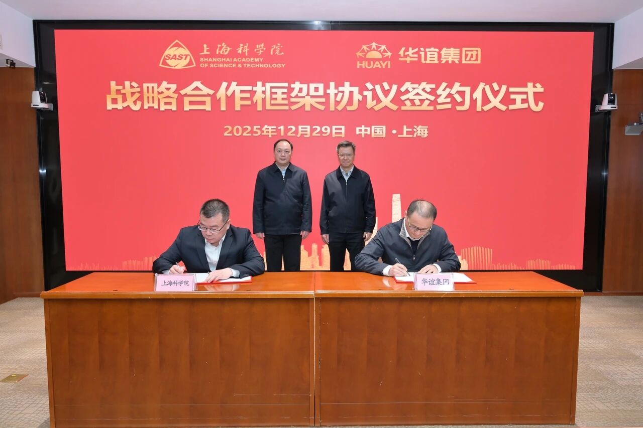 2025年12月29日下午,华谊集团与上海科学院在华谊集团大厦举行战略合作协议签约仪式,并开展交流座谈。上海科学院党委书记秦文波,华谊集团党委书记、董事长顾立立出席并见证签约。上海科学院党委副书记、院长孙真荣与华谊集团党委副书记、总裁钱志刚代表双方签署战略合作协议。